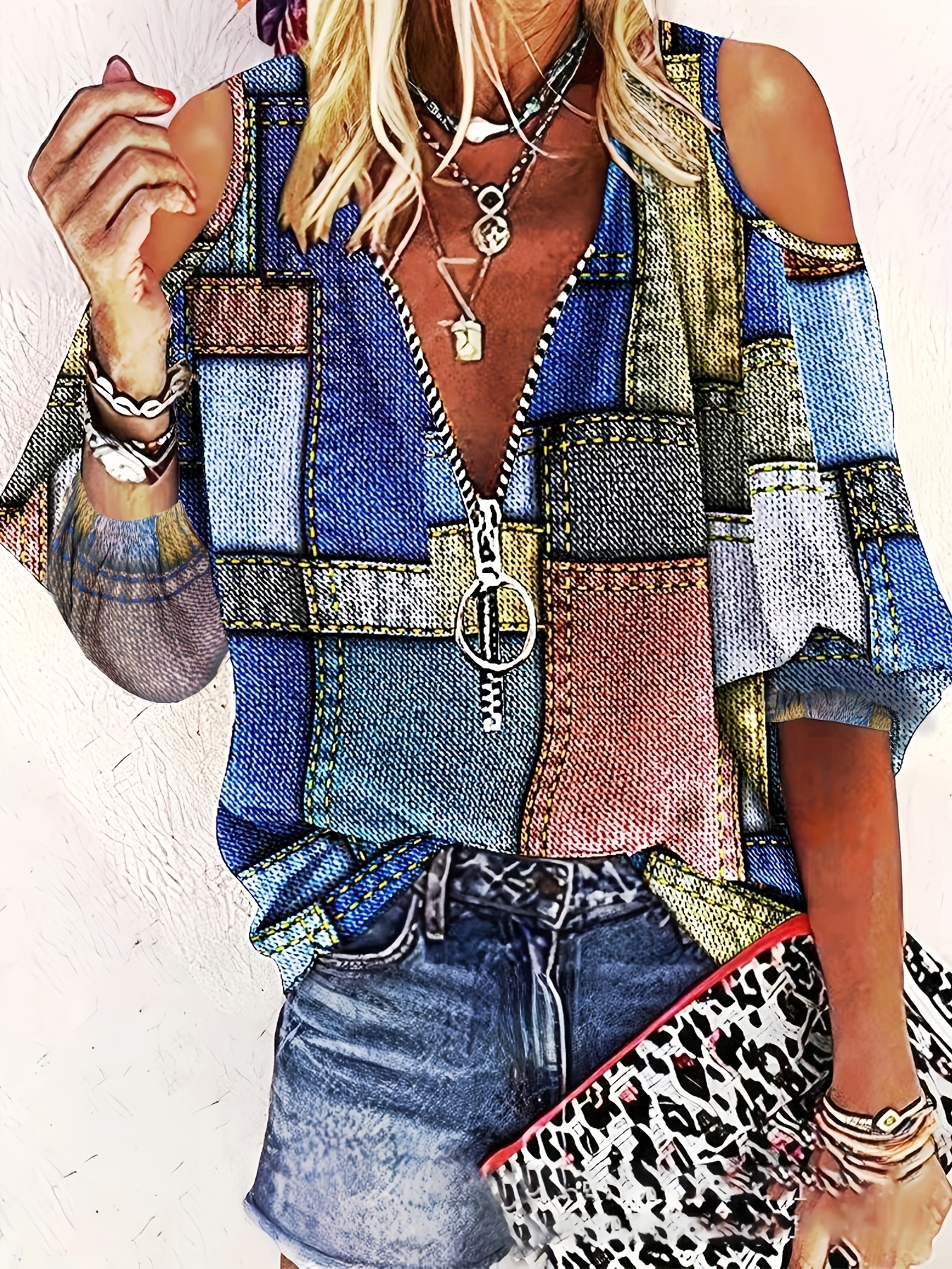 Irregular Stripe Zipper Front Blouse, Casual Cold Shoulder Blouse For Spring & Summer, Women’s Clothing