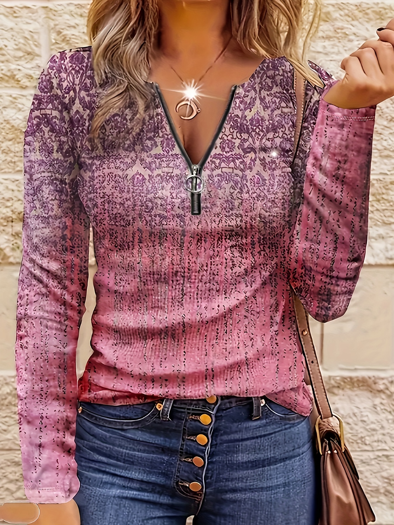 Abstract Print Half Zip Blouse, Casual Long Sleeve Blouse, Women’s Clothing