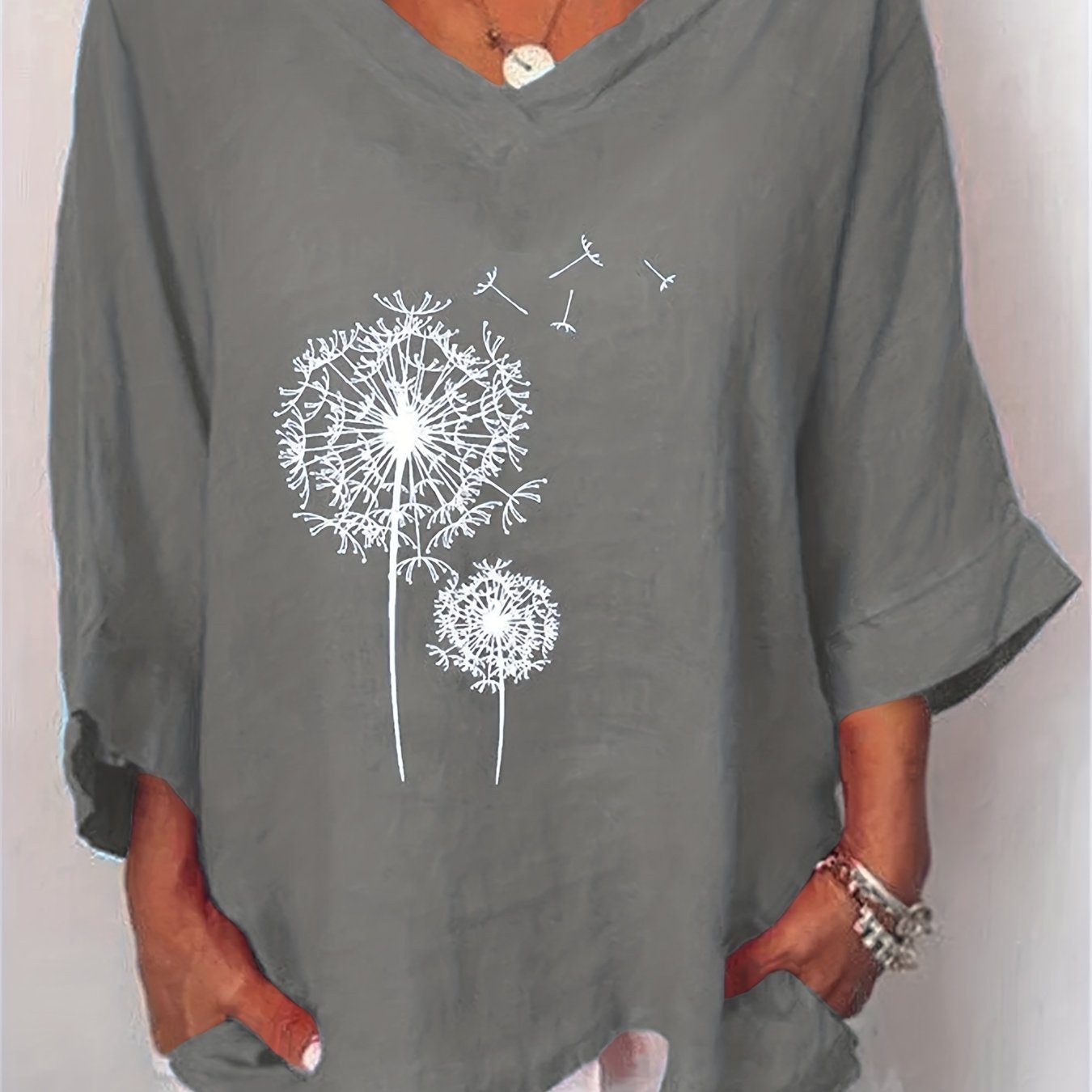Dandelion Print Blouse, Casual V Neck 3/4 Sleeve Blouse, Women’s Clothing