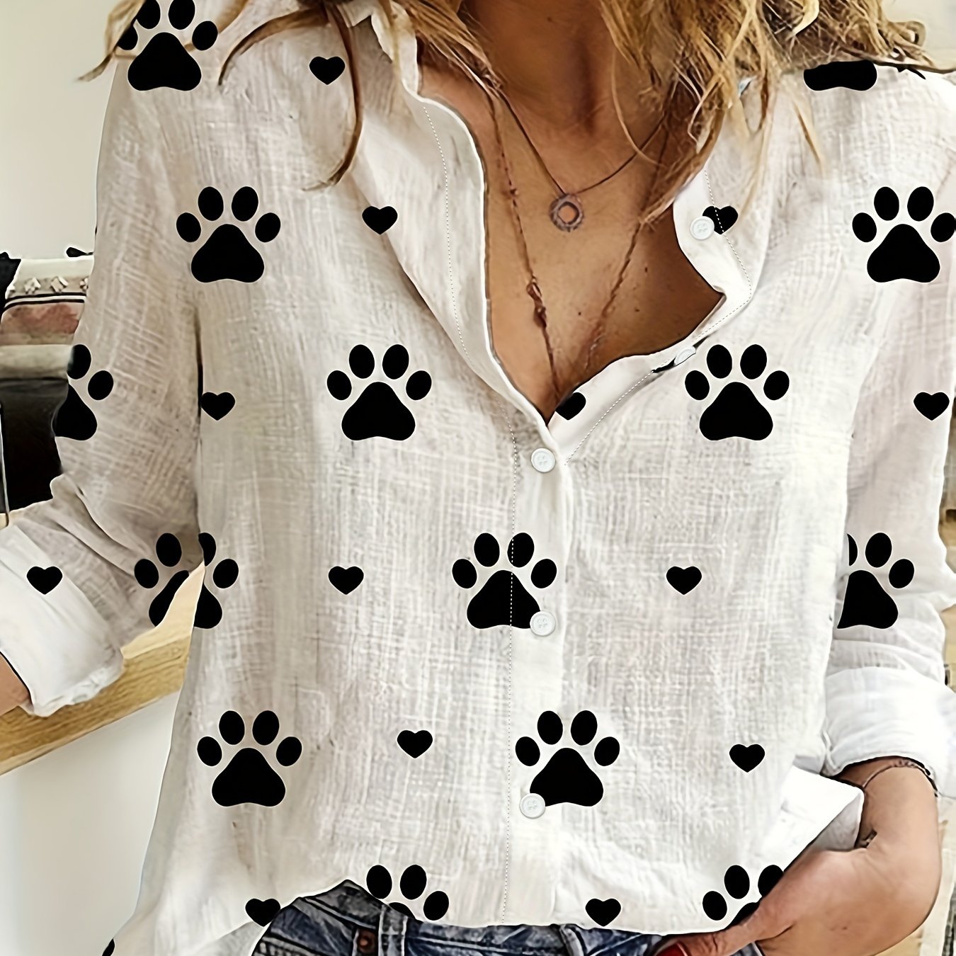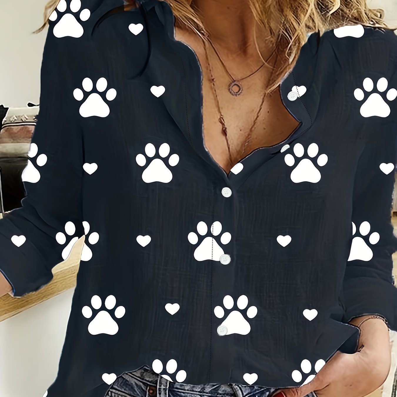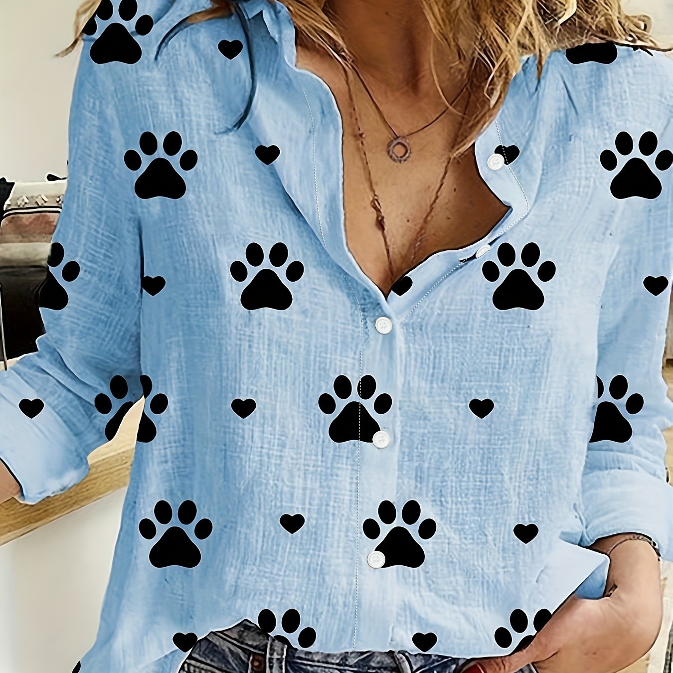 great Paw Print Button Front Shirt, Casual Long Sleeve Shirt For Spring & Fall, Women’s Clothing