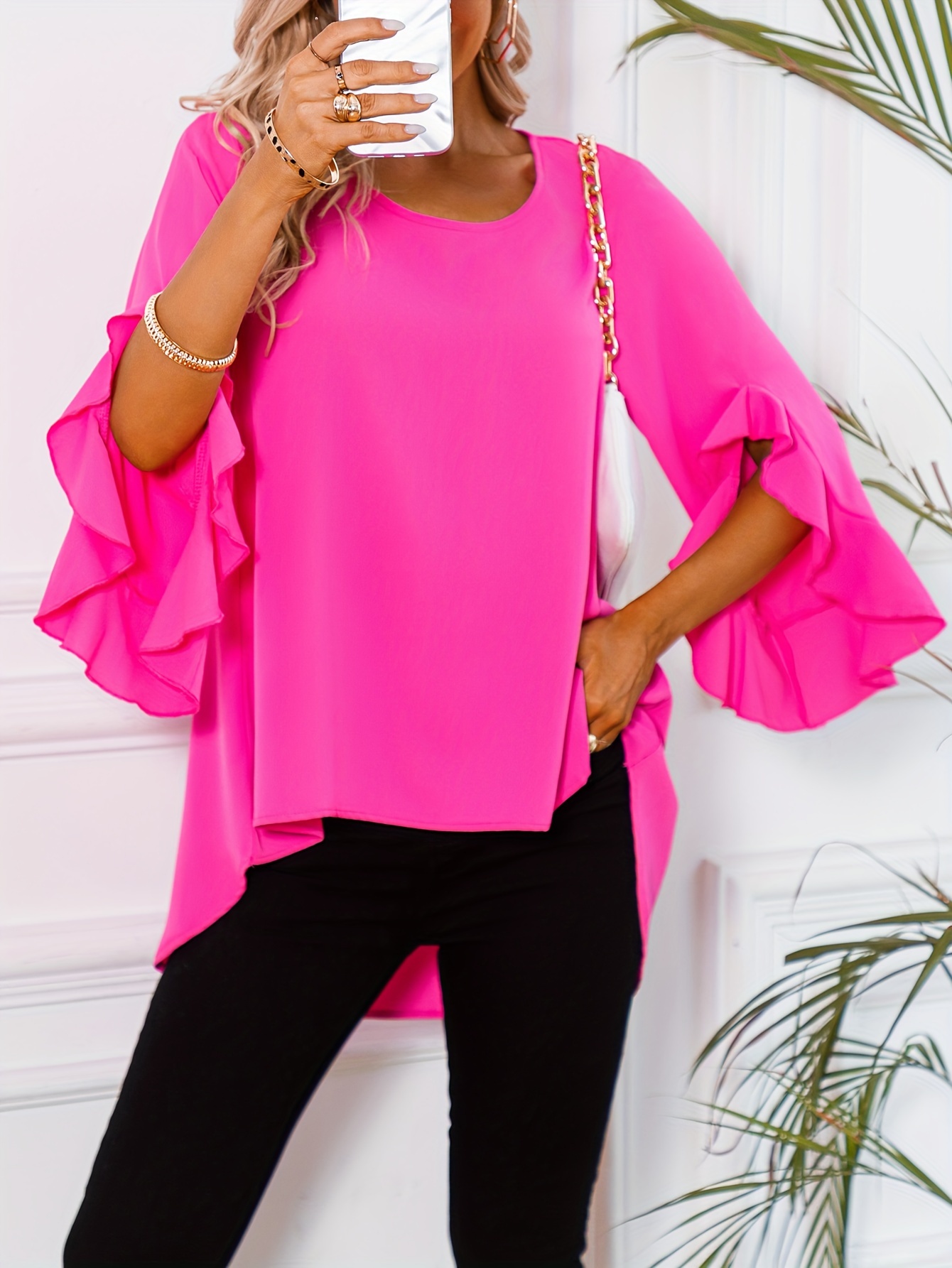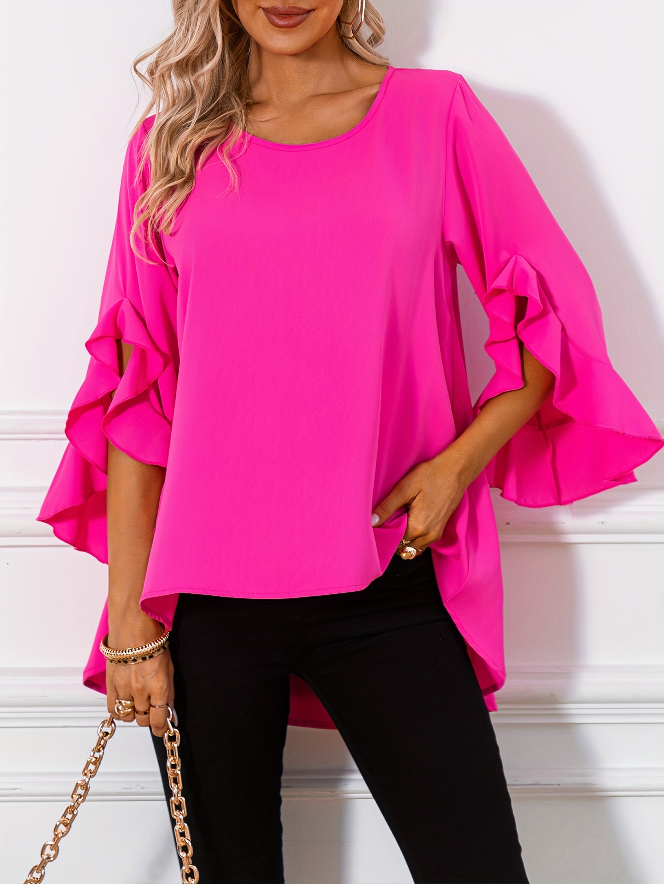15 reviews for Solid Crew Neck Blouse, Casual Ruffle Sleeve Blouse For Spring & Fall, Women’s Clothing